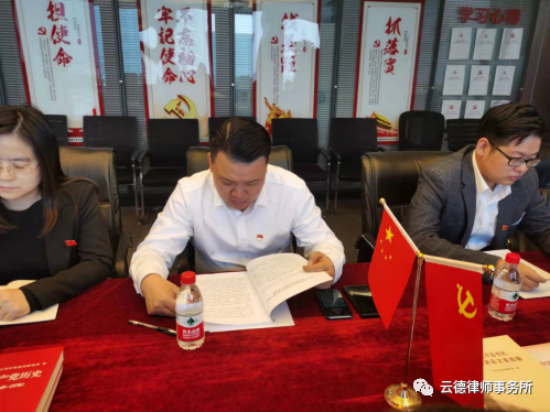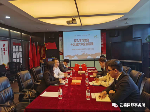 2021年11月24日下午,云德律師事務所第二黨支部傳達學習了黨的十九屆六中全會精神。會議由黨總支副書記、第二黨支部書記胡小青同志主持,支部黨員及入黨積極分子參加會議。